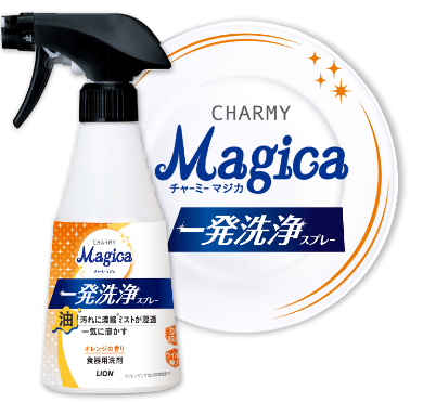 従来の食器用洗剤は、泡で油汚れをこすり落としていました。食器用洗剤「Magica(マジカ)」は油汚れを徹底的に細かく分解して浮かせるため、汚れを落とす時間もすすぎの時間も短縮できるのです。